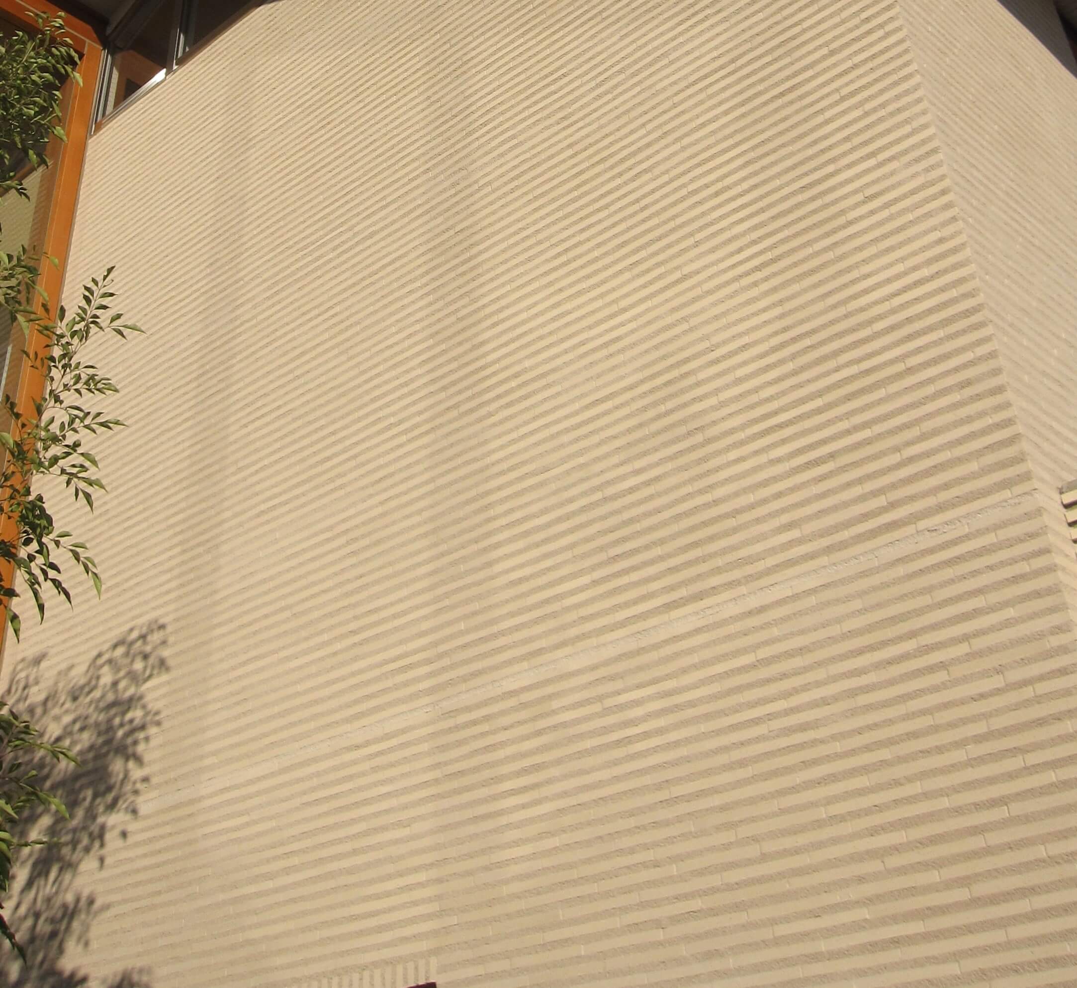 そこで採用したのが、この弾性目地だった。ブリック目地と色を揃え、さらに表面の質感もできるだけ近づける。施工を丁寧に行い、仕上がった壁面を少し離れて見ると、どこが伸縮目地なのかほとんど分からない。(※ ただし雨天後、濡れると目立つ)