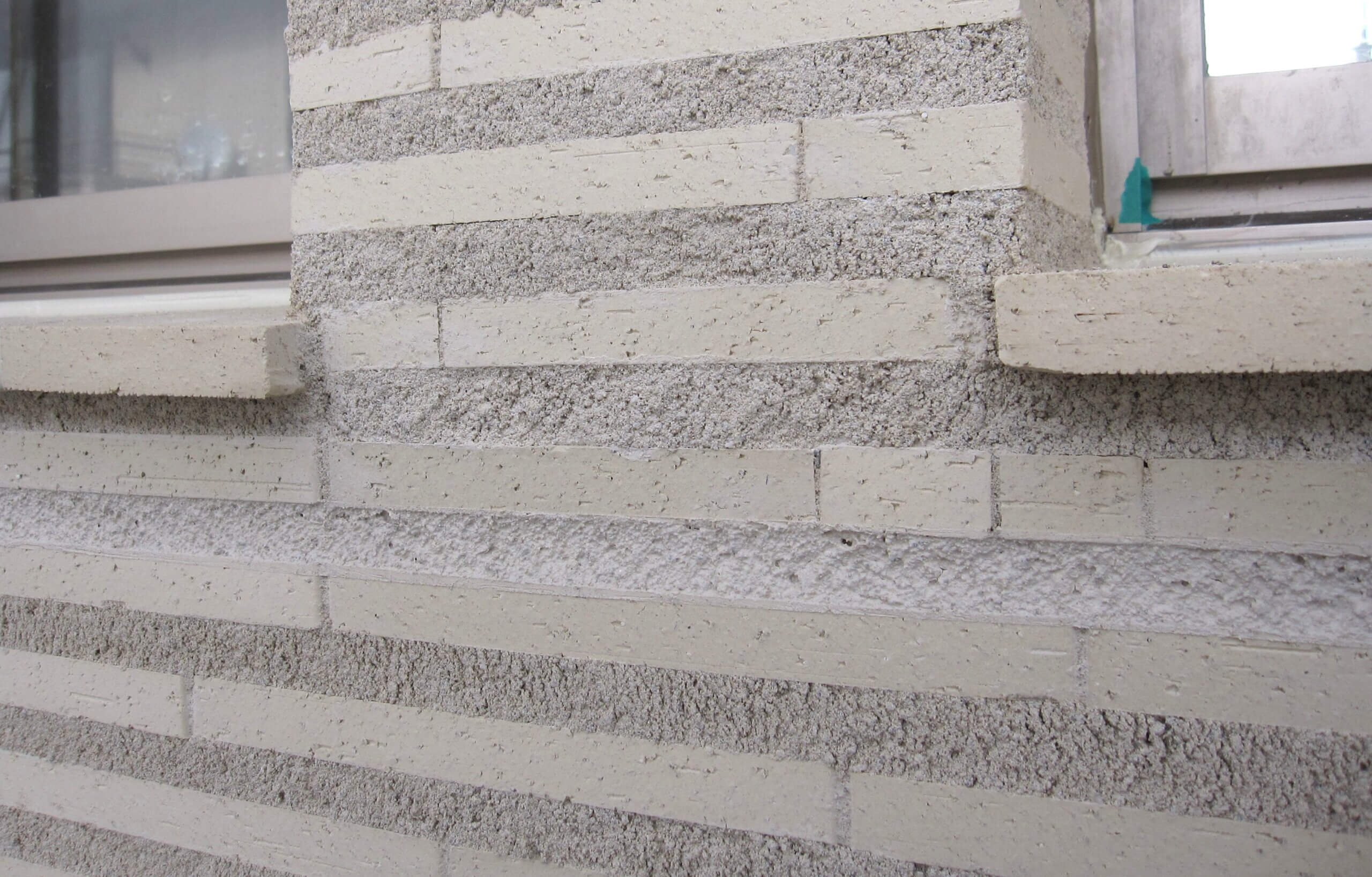 これは、ブリック目地と同じ色調で仕上げられた、伸縮目地用の化粧材である。見た目はシーリングというより、むしろモルタル目地に近い質感を持っている。表面の艶感が抑えられており、光の当たり方も通常のシーリング材とは異なる。