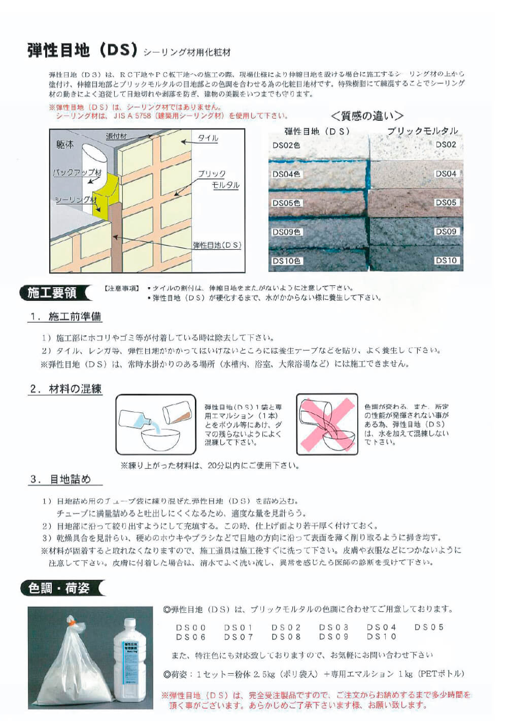 レンガタイルの仕上げにおいて伸縮調整目地を設ける場合、施工するシーリング材の上から弾性目地を塗付けることにより伸縮調整目地部とブリックモルタルで施工した化粧目地部との色調・風合いを合わせる事で壁面の意匠を統一し、壁面の付加価値を高める材料である。
