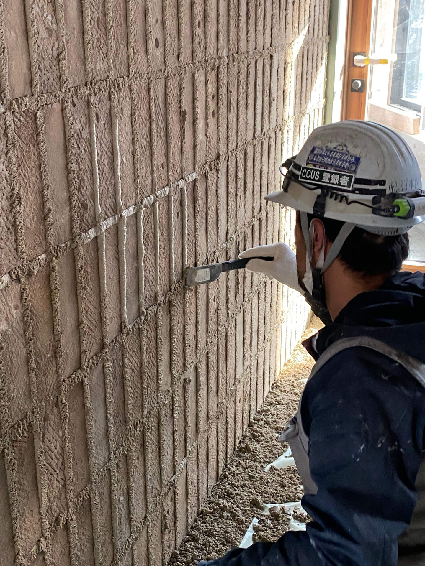 外装ならまだしも、内装で希塩酸水洗いができない壁の為、タイル自体を目地で汚さないように詰めなければならない。内部は無風の為、乾燥のタイミングをみてへらで掻き落とししていく。単に、規則的で平滑な仕上がりでも無く、自らの感覚で微調整していかねばならない。
