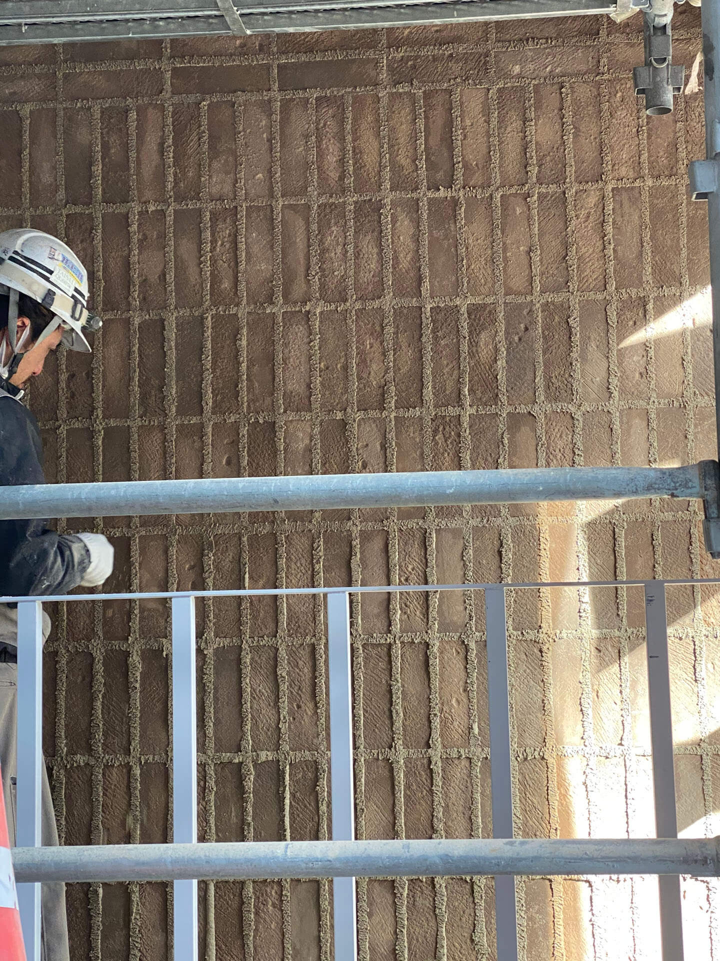 水分のタイルへの吸い込み斑と掻落し前の出目地との表情が、最終仕上げでは見られない美しい壁面となっている。