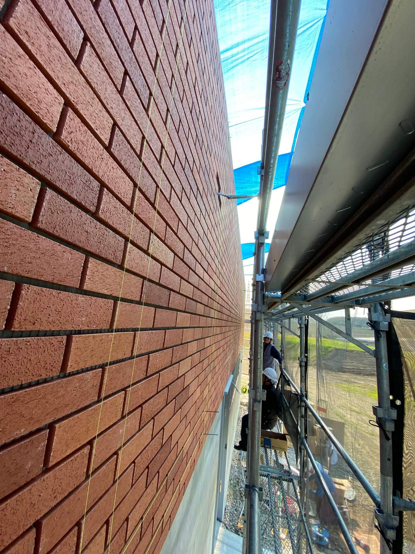 初回施工時に特注色をご検討いただき、社長に選んでいただきました。当時からのご要望を、引き続き吟味しながら、工場で試作テスト焼成を行い、現在の土(原料)と窯の雰囲気を微調整しながら本焼きを迎えました。濃淡での微妙な焼き加減は、赤レンガの場合もなかなか難しいものです。検品時に微妙な混合調整を経て今回のロットへとつながっています。単なる色合わせとは違って、増築を意識した自然な壁面の完成となりました。