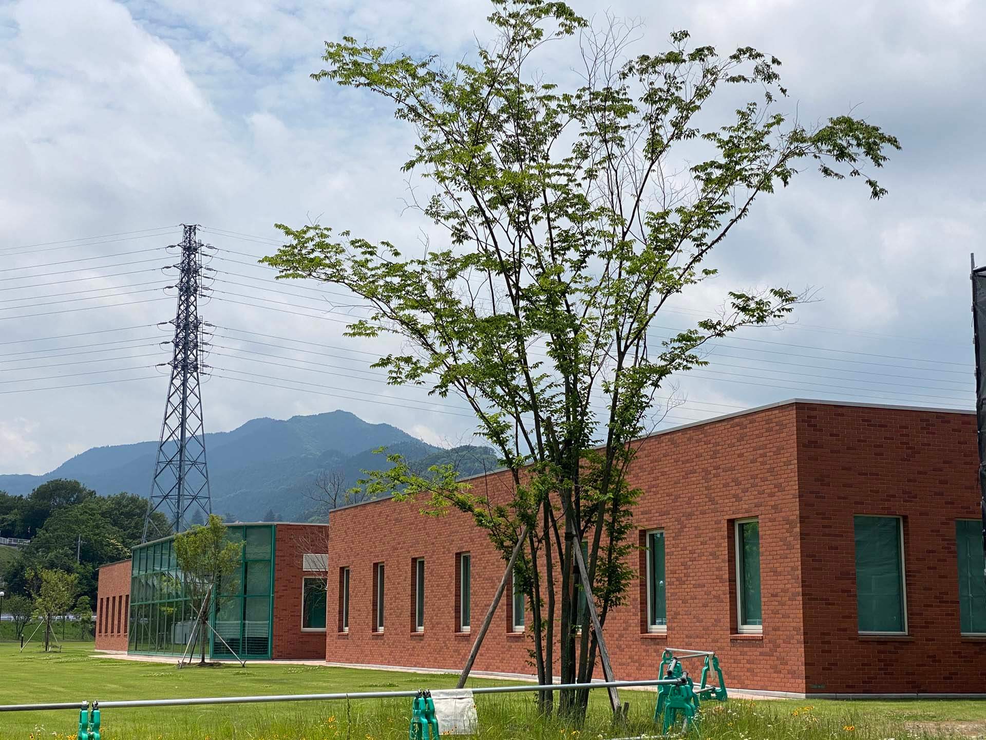 工業団地のみどり多き植栽の中に、赤レンガの品質管理棟がひときは華やいで