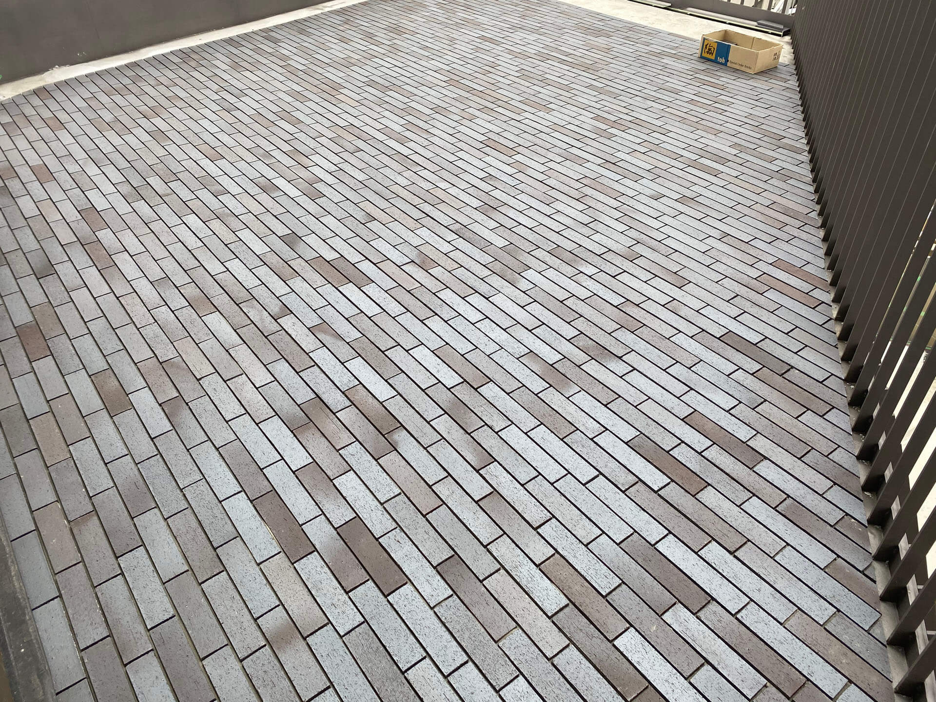 店舗併設住宅レンガタイル二丁掛還元黒系を床に施工