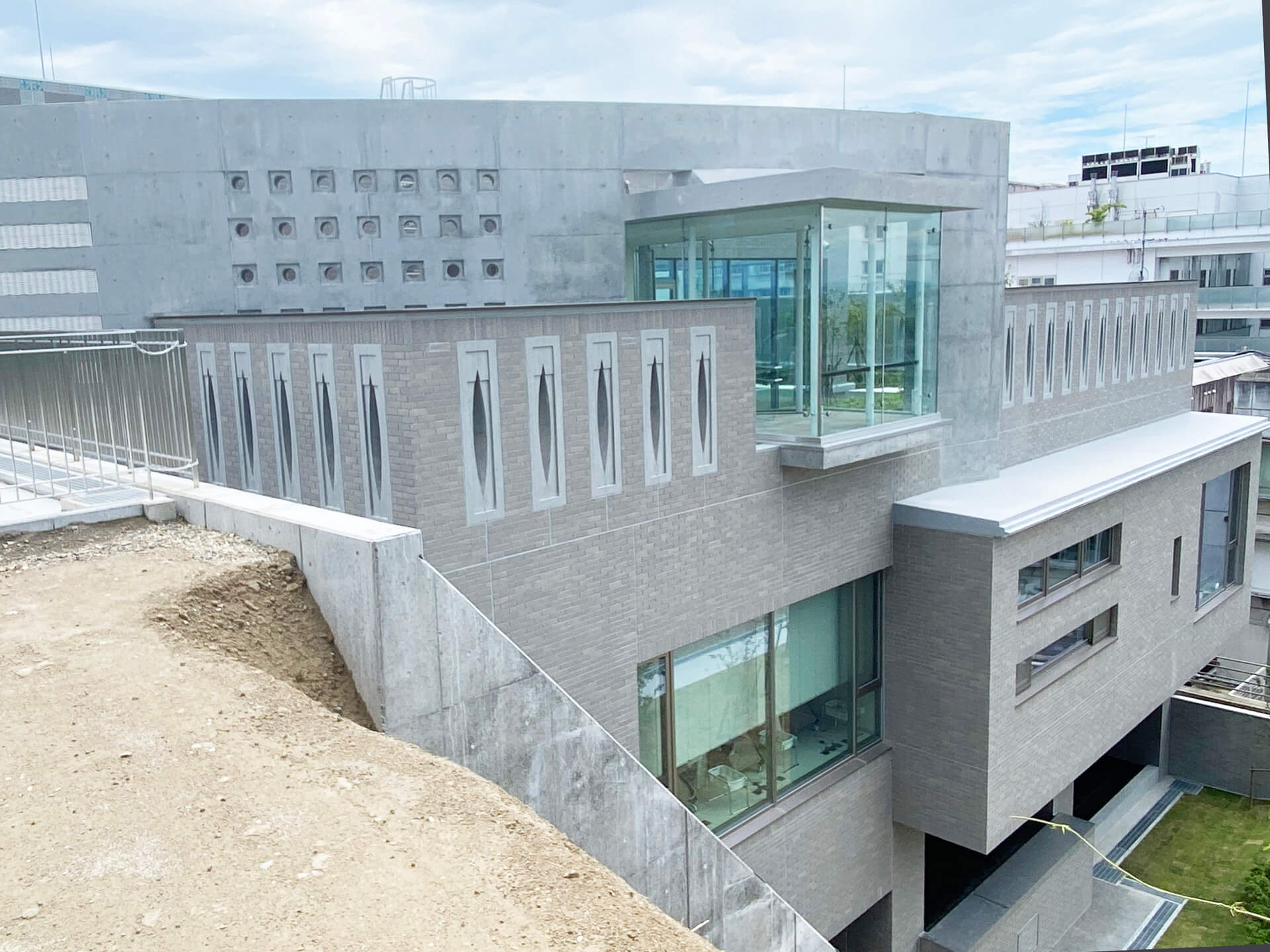 East Center、エントランス整備工事に引き続き、今回の癌治療センターにも同色の特注レンガタイルをご採用いただきました。コンクリート打ち放し面と違って、焼き物の煉瓦を使用することによって暗くなりがちな壁面に、晴天時はブルーグレーの発光を醸し出します。病院全体の統一したカラー計画が、いっそう安定した環境を作り出し、総合病院の風格が存在しています。