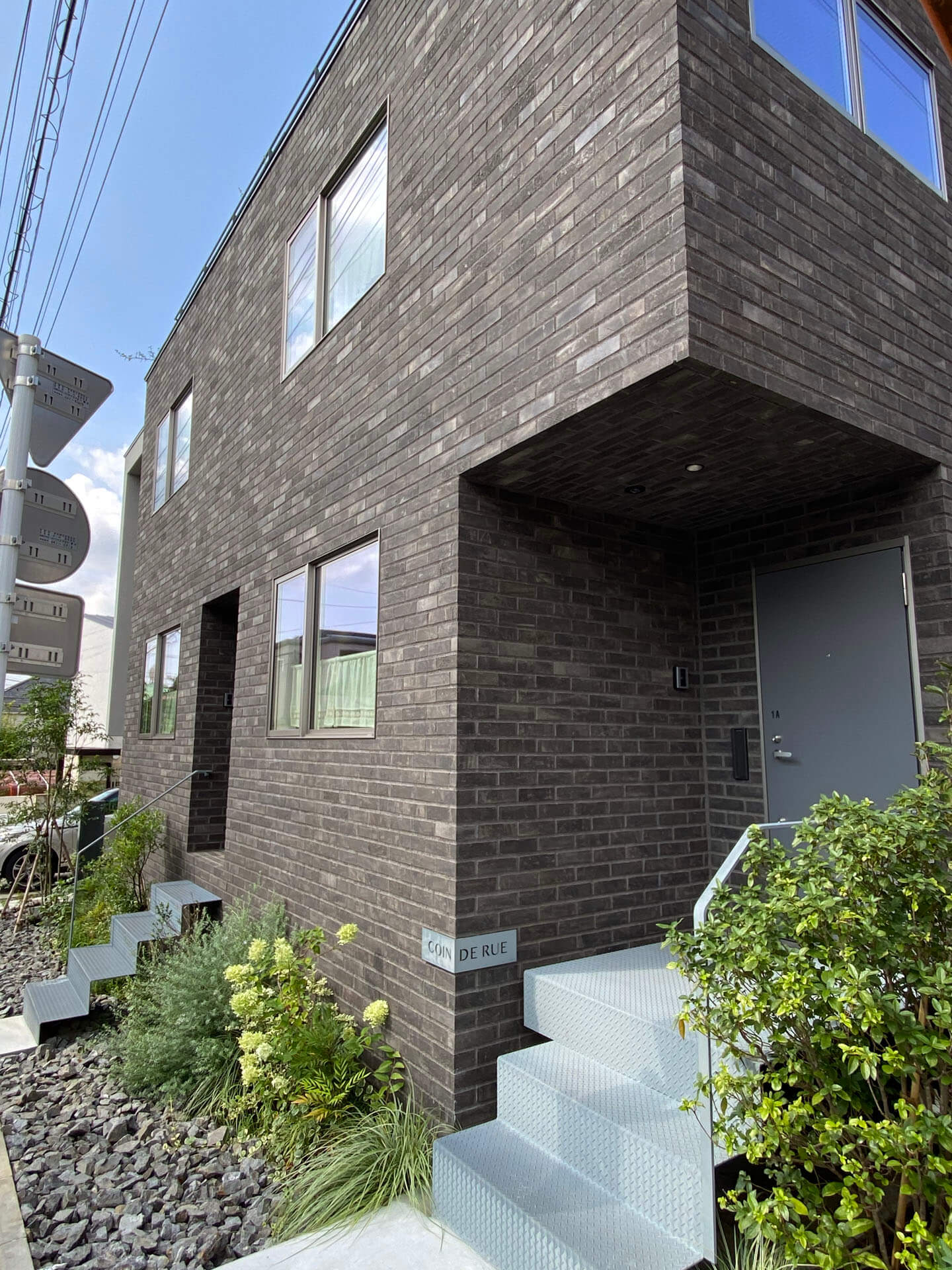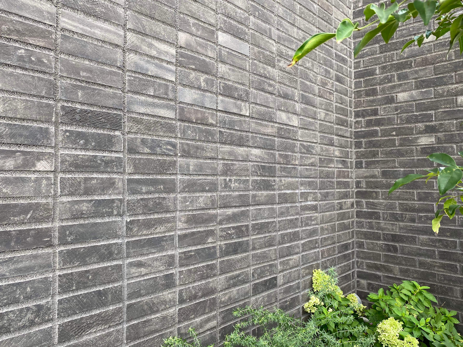 太陽光線にあたると、建築家のイメージの黒とは違ってなにか物足りなくなって来ます。目地も色彩の一部と化して、どの色がほんとうに求めている外壁なのか、想像の世界では決められず、モックアップを作ってはじめて次の決断が出来ていきます。