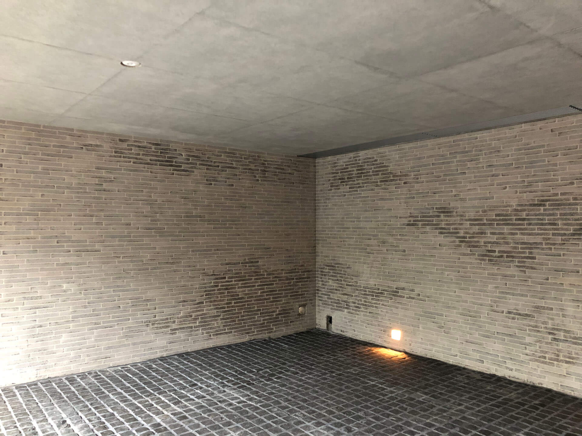 建築家からのお題は、「風化した壁面」。長い年月を経た壁面が、以前から建物が存在していたかのような雰囲気を違和感なく表現しなければならない。タイルとかレンガとか石とか、ひとつひとつの個々の素材感が露出せず、壁として先に存在を感じ取ってもらうような壁だ。