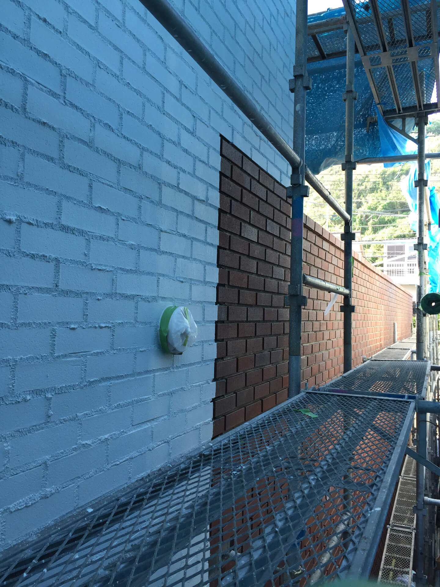 目地は、ザックリと塗装後の白い壁面の陰影と起伏の意匠効果を狙って、計画的に壁面のリズムまでを考え施工した。壁面と近い目線でチューブで詰める感覚と掻き落とす時の遠距離での目線を考え感性が問われる仕事となった。かえって逆に目地の技術者自体は、いつも以上に活き活きとしている。これが、建築の面白さだ。タイルでありながらもれんが積みのイメージを徹底して表現しようと、役物の返しも一切50mmサイズは使用していない。210と100になるようあらゆる工夫を施した。入り隅みは、左右交互の差し込み仕上げとし、関連する役物は、まさにパズルのような現場管理だった。