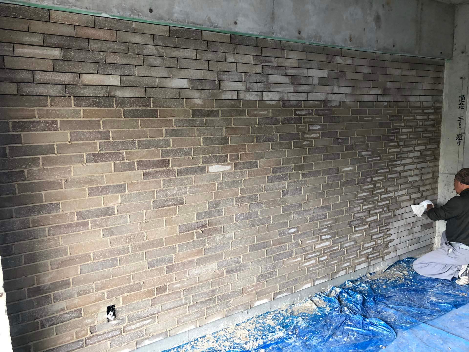 サンプルをつくり、多方面から検討を重ねたものの、実際に現場に入ってから気づかされることも多く、作業場はまるで実験室や研究室のような空気に包まれていった。削りの深さ、研磨の加減、目地との関係、光の当たり方。ひとつの判断が、壁面の印象を大きく左右する。