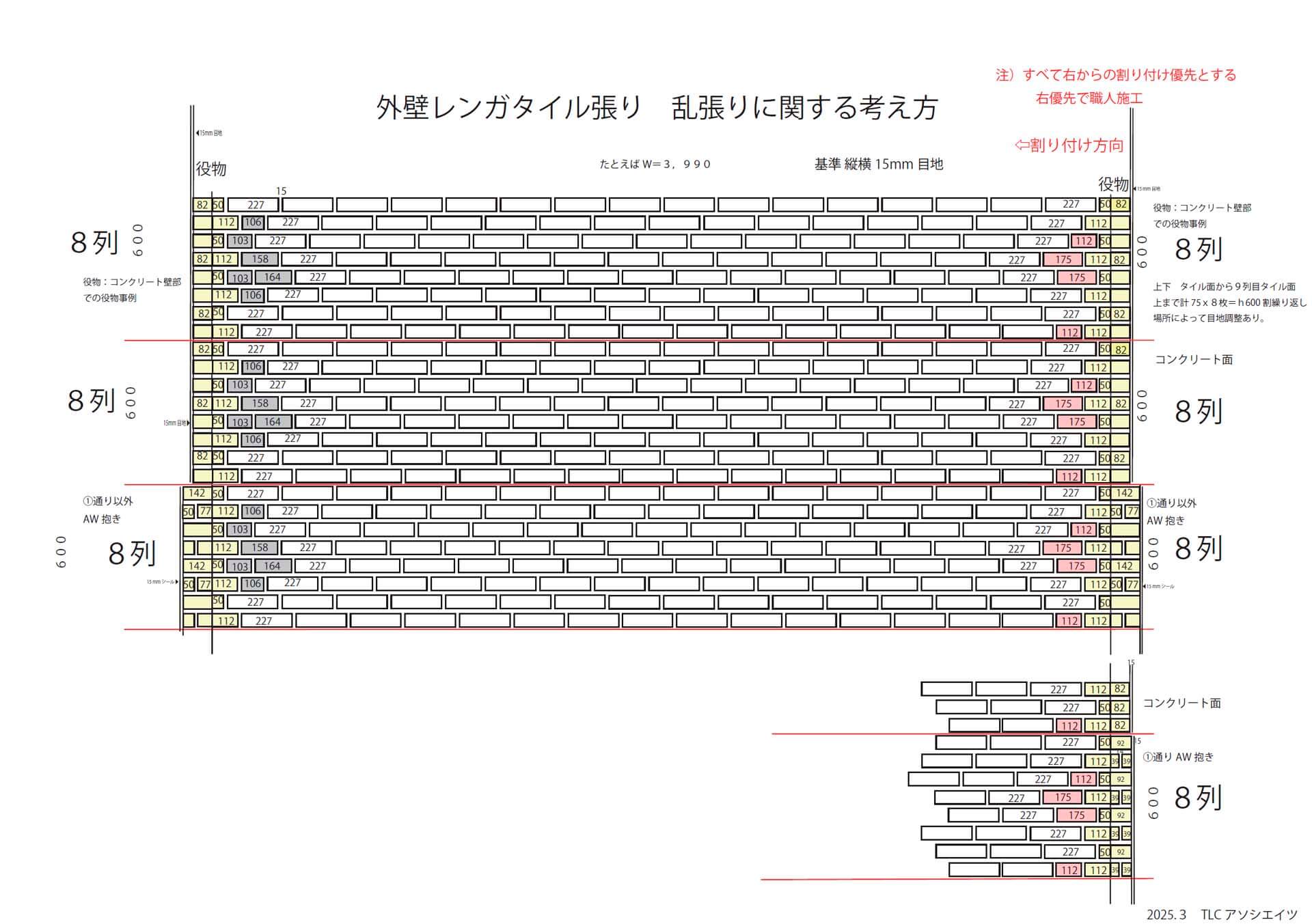 3,目地は、縦横15mm幅としてタイル面状同様のブリック目地の掻き落とし仕上げ。