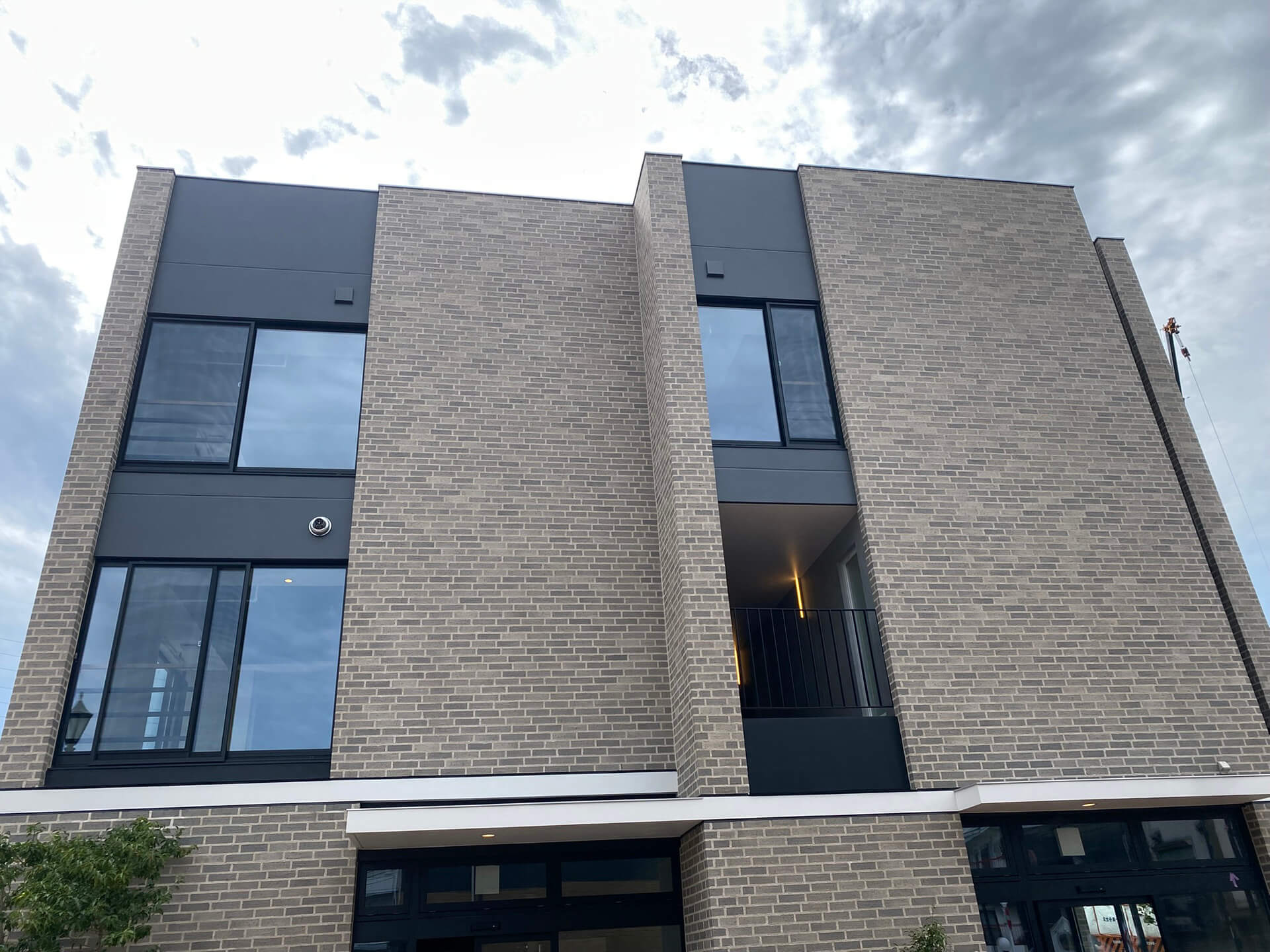 「レンガタイル」を壁面に計画され様々な検討の末、今回の色合いに落ち着きました。
