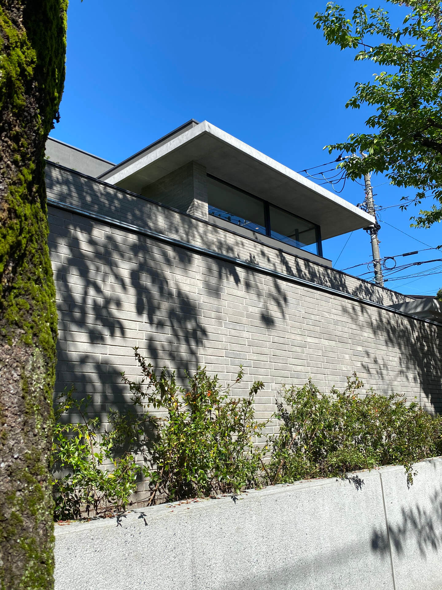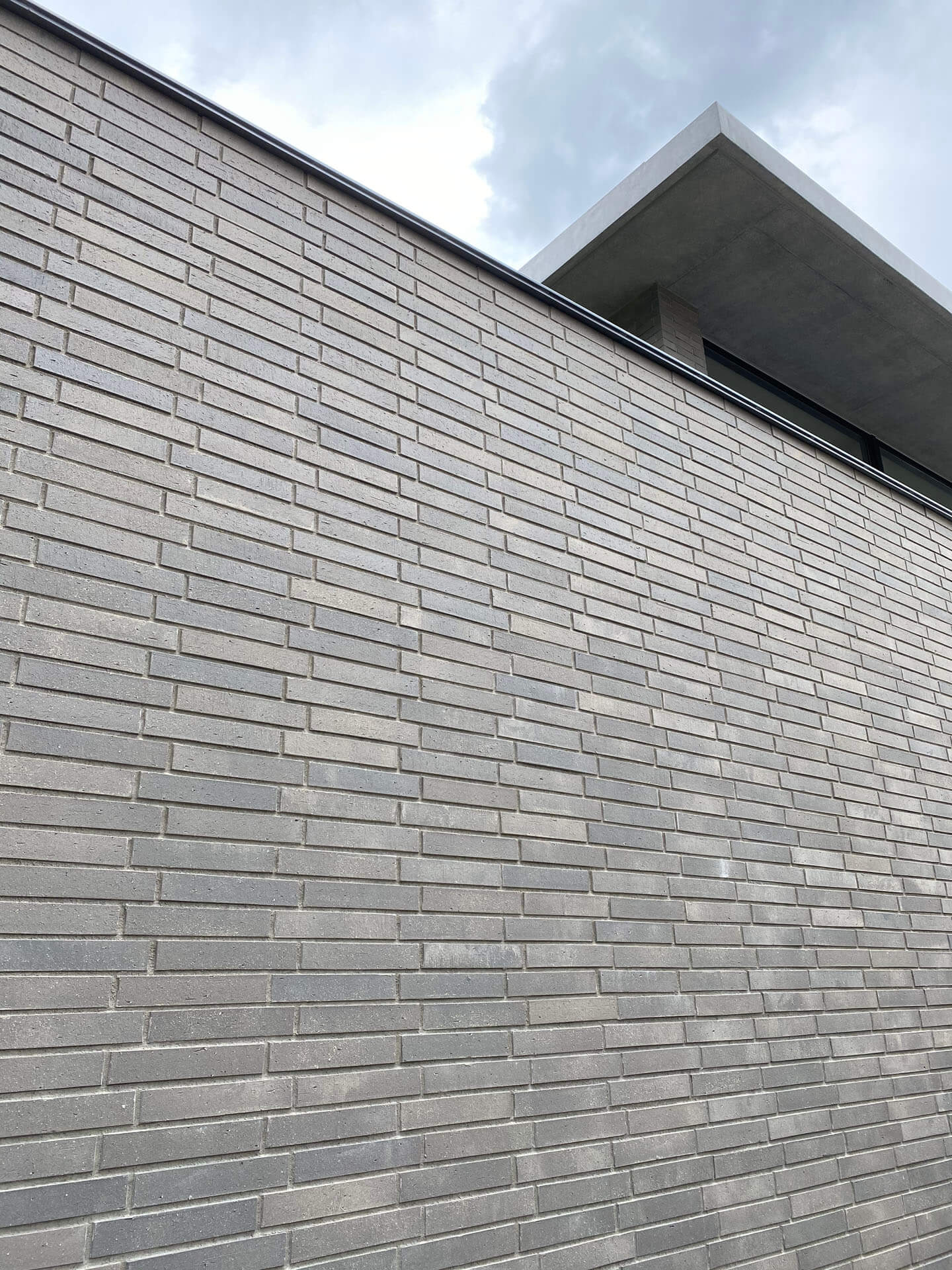 炻器質40mmボーダータイル、形状40x227x15mm おとなしい粗面面状にさらっと少量の土掛けを施した窯変タイルです。細目地6~8mmに、ブリック目地をチューブで詰め、面落ちで掻き落とししました。
