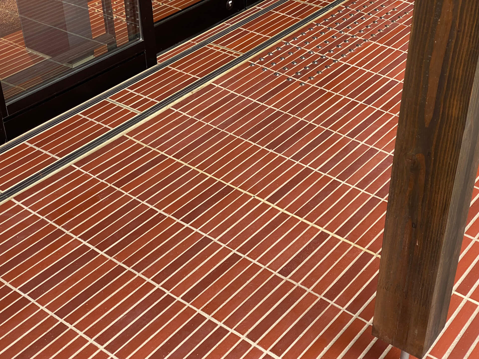 外壁の焼杉板張りと内装の黒天井空間に、床のスリムな渋めの赤タイルが効果的に